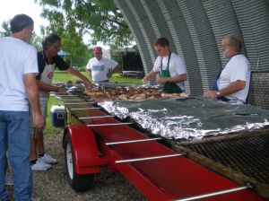 Sunday we had a church picnic at our house, with about 90 people. We borrowed a grill, set up tables and set out toys for the sand box. Actually, we borrowed a huge grill, one big enough to grill ten racks of ribs, six whole pork loin, ten chickens and two bushels of corn—all at the same time.