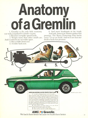 After that it was all downhill. You can tell by the fact that I may be the only man in history to trade a Camaro for a Gremlin. There is no way to remember all the cars I’ve forgotten. Or any reason to.