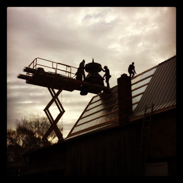 It looks fairly small up there on the barn roof, but down on the ground it turns out to be 4 foot across the bottom and about 7 foot tall, not counting the weather vane. Even after they hoisted it up on the scissor lift to the hip of the barn, it was somewhat unsettling to watch them move it up to the top and perch there, without safety harnesses, on the top of the world.
