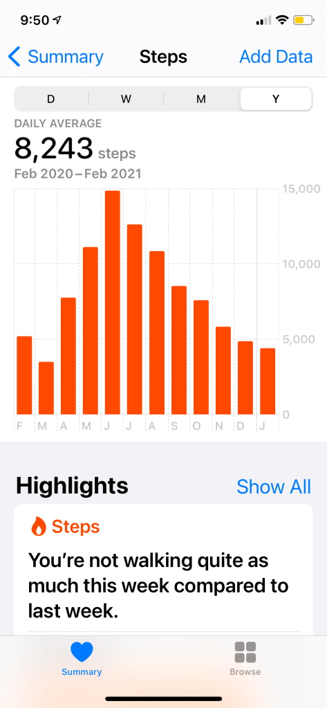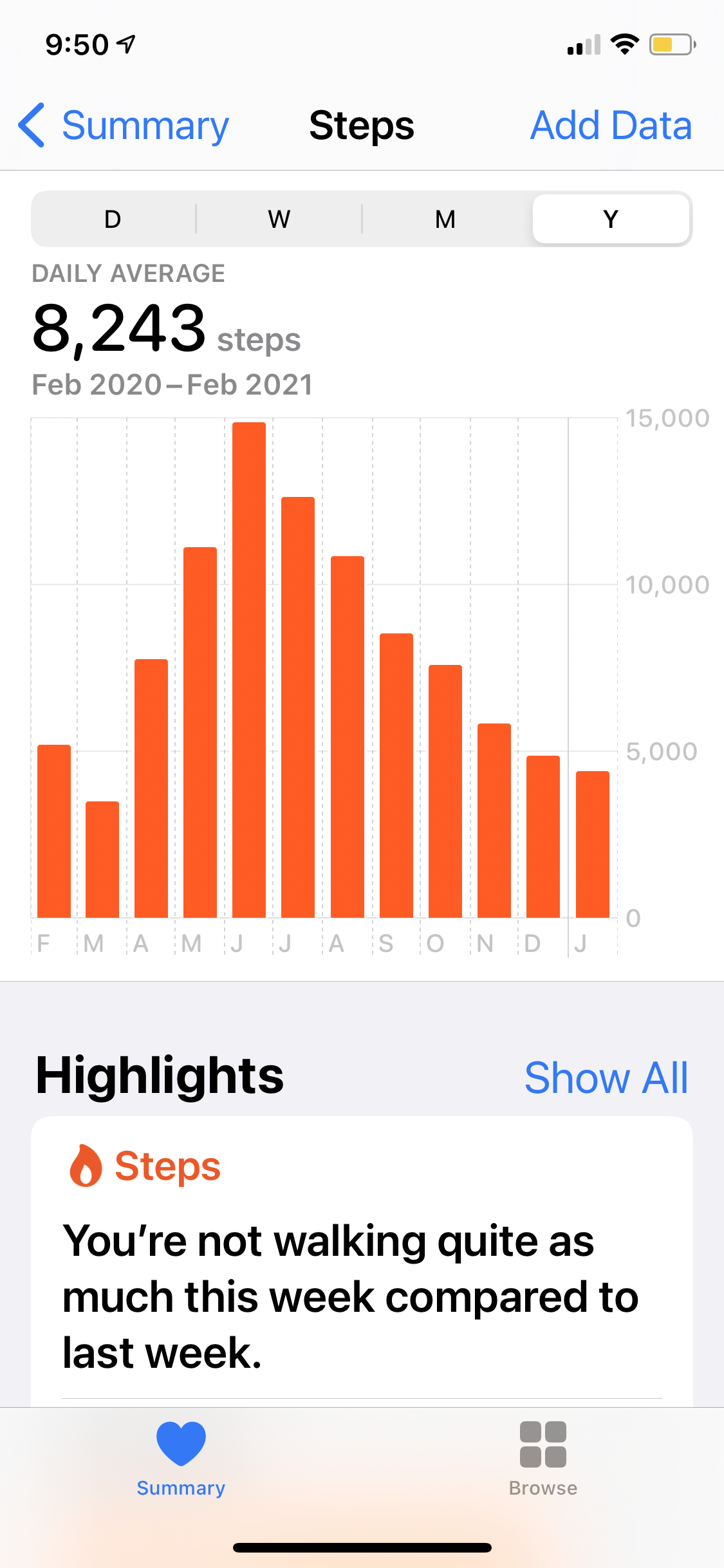 But I actually find I have a hard time managing my daily routines, much less disciplined creative pursuits. Take exercise, as an example. In 2019, I averaged 8198 steps per day, and increased to 8464 in 2020, even with being flat on back with Covid-19 for a month. January 2021? A measly 4406 steps per day.