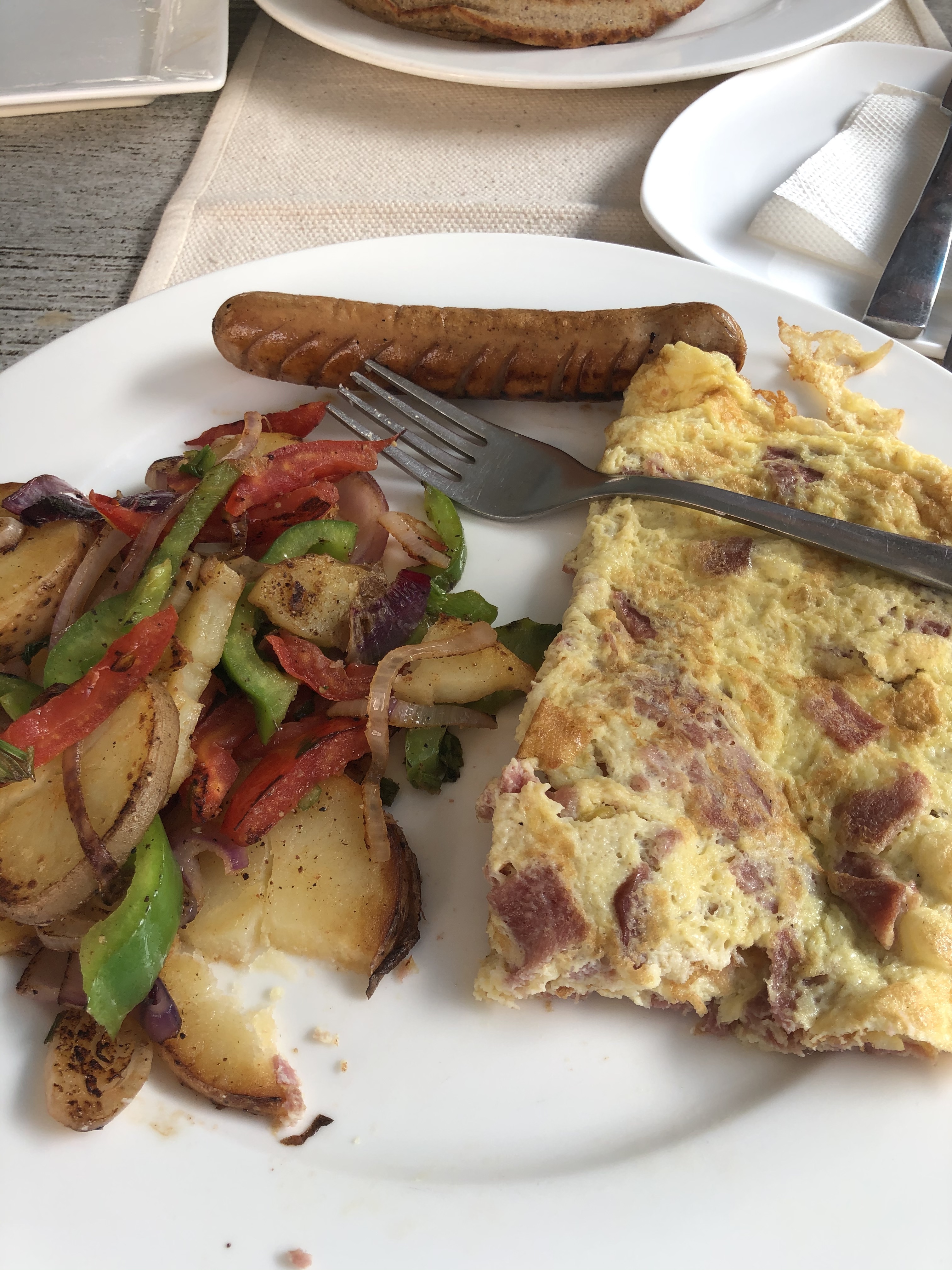 When we got back to our apartment, we chatted with a couple of our kids back in the USA. It turns out we have excellent internet service here. And then today, Sunday, which we have chosen as our day off, we continued the birthday celebration with a long walk and breakfast in Thamel, a tourist-friendly district without any tourists these days. On an outdoor patio at the Blueberry Kitchen, I got an omelet, with chicken sausage, hash browns, and that fresh-squeezed orange juice for about $3.80 US.