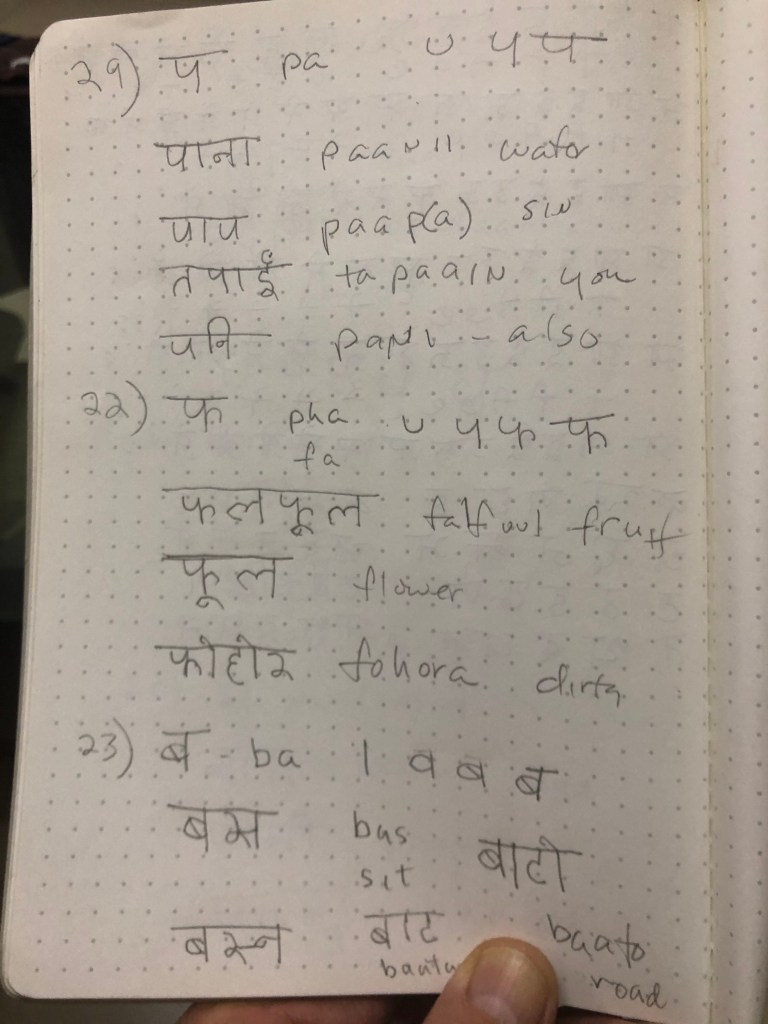 So learning a new language and the stimulation of interacting with people in a different culture is keeping us on our toes. The language is especially challenging. We are learning a new alphabet, and it’s so complex that even school children here prefer to study English, with its measly 26 letters. In the Devanagari script, there are 14 vowels and 36 consonants. Or 33, depending on whom you ask. But it’s even more complicated than that.