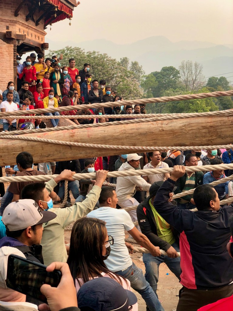 Communities also erect huge poles, called linga, at some point, for the purpose of pulling them down on New Year’s Eve. The poles are about 80-feet tall; lots of pulling and carrying involved, and also another tug-of-war. This represents the defeat of some demon in Hindu mythology. We saw them trying (unsuccessfully) to raise a pole in Bhaktapur, and something similar happened near Asan earlier, during a different festival. We saw another one in another part of Bhaktapur, as different neighborhoods celebrate in different ways.